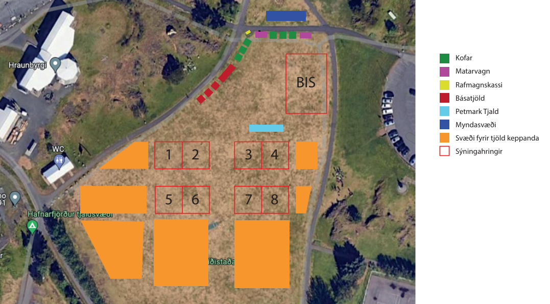 Vinsamlegast skoðið myndina hér fyrir ofan hvar má tjalda. Skipulag svæðisins og hringja má sjá hér að neðan. Bendum á að myndin er ekki í réttum hlutföllum, en hún sýnir grófa yfirsýn á svæðinu.