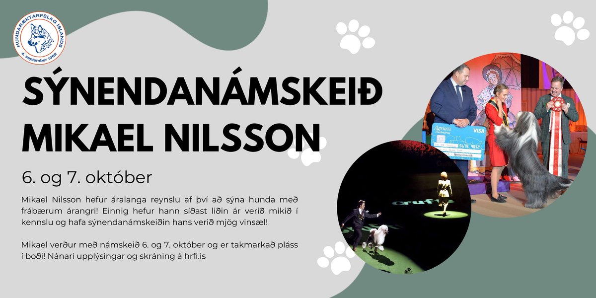 Mikael Nilsson heldur sýnendanámskeið á vegum félagsins strax eftir októbersýninguna en Mikael er einn af dómurum sýningar félagsins í október. Hann er eigandi ræktunarnafnsins KUDOS og hefur ræktað allar stærðir af poodle síðan 1993. Í 10 ár ræktaði hann einnig pomeranian. Hann hefur sýnt og ræktað poodle hunda síðan hann var unglingur og hefur náð mjög góðum árangri sem bæði sýnandi og ræktandi. Hann hefur sýnt fjölda hunda í gegnum árin með frábærum árangri, meðal annars Best in Show og Crufts og heimssýningu. Hann hefur einnig átt, ræktað og/eða sýnt stigahæstu hunda ársins í mismunandi löndum. Hann hefur unnið með hundum í fjölda ára sem snyrtir, sýnandi og kennari.